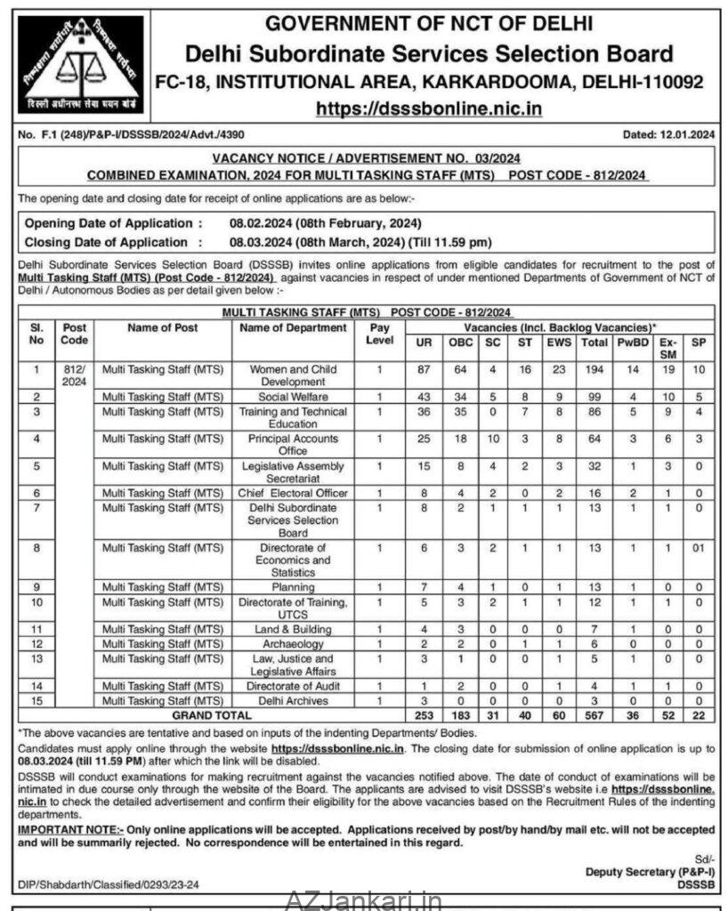 DSSSB Multi Tasking Staff Recruitment 2024 अधिसूचना: