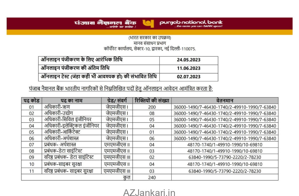 पंजाब नेशनल बैंक (पीएनबी) द्वारा विशेषज्ञ अधिकारी भर्ती 2023 के लिए अधिसूचना जारी की गई है। पंजाब नेशनल बैंक में 240 विशेषज्ञ अधिकारी पदों की भर्ती निकाली गई है। PNB Specialist Officer Recruitment 2023 के लिए इच्छुक और पात्र उम्मीदवार आधिकारिक वेबसाइट के माध्यम से ऑनलाइन आवेदन कर सकते हैं। PNB Specialist Officer Recruitment 2023 के लिए ऑनलाइन आवेदन करने की प्रक्रिया और सीधा लिंक नीचे दिए गए हैं। PNB Specialist Officer Recruitment 2023 के लिए ऑनलाइन आवेदन 24 मई से 11 जून 2023 तक किया जा सकेगा। PNB Specialist Officer Recruitment 2023 की पात्रता, आयु सीमा, आवेदन शुल्क और सभी जानकारी नीचे दी गई है। उम्मीदवारों को आवेदन करने से पहले आधिकारिक अधिसूचना को एक बार जरूर देख लेना चाहिए।